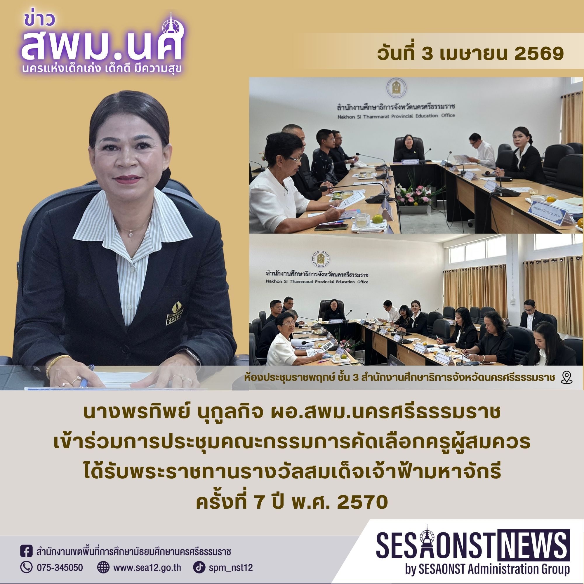 นางพรทิพย์ นุกูลกิจ ผู้อำนวยการสำนักงานเขตพื้นที่การศึกษามัธยมศึกษานครศรีธรรมราช เข้าร่วมการประชุมคณะกรรมการคัดเลือกครูผู้สมควรได้รับพระราชทานรางวัลสมเด็จเจ้าฟ้ามหาจักรี ครั้งที่ 7 ปี พ.ศ. 2570 โดยมี นางวจิราพร อมาตยกุล รองผู้ว่าราชการจังหวัดนครศรีธรรมราช เป็นประธานในการประชุมครั้งนี้