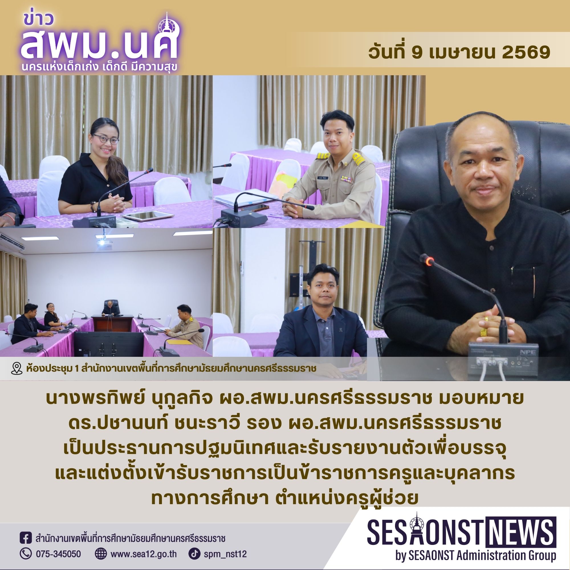 นางพรทิพย์ นุกูลกิจ ผู้อำนวยการสำนักงานเขตพื้นที่การศึกษามัธยมศึกษานครศรีธรรมราช มอบหมาย ดร.ปชานนท์ ชนะราวี รองผู้อำนวยการสำนักงานเขตพื้นที่การศึกษามัธยมศึกษานครศรีธรรมราช เป็นประธานการปฐมนิเทศและรับรายงานตัวเพื่อบรรจุและแต่งตั้งเข้ารับราชการเป็นข้าราชการครูและบุคลากรทางการศึกษา ตำแหน่งครูผู้ช่วย