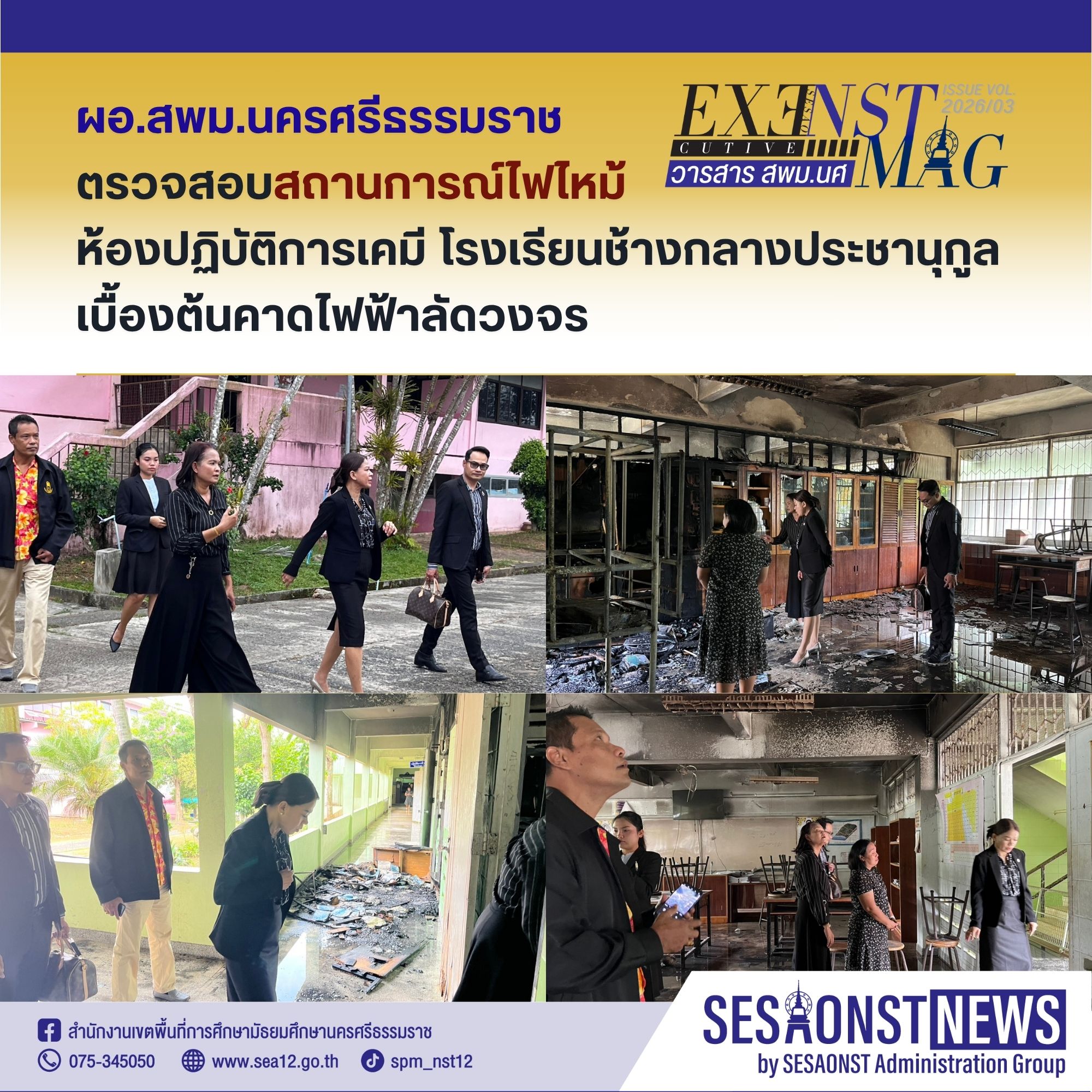 ผอ.สพม.นครศรีธรรมราชตรวจสอบสถานการณ์ไฟไหม้ห้องปฏิบัติการเคมี โรงเรียนช้างกลางประชานุกูล เบื้องต้นคาดไฟฟ้าลัดวงจร